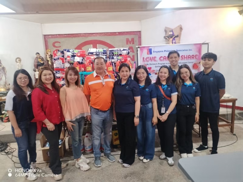 (PFOCN AdminHR team, SPA President Andrew Koh, and Singapore Embassy's Ms. Wingda Tan lead volunteers at Lourdes Handicapped Center, bringing joy and support to the community)